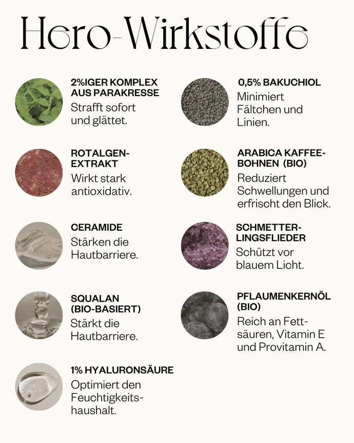 Feines veganes und duftfreies Augenserum für empfindliche Augenpartie mit perfekt abgestimmten Inhaltsstoffen. Drin stecken Parakresse (a.k.a. "Bio-Botox", weil es einen sofort straffenden Effekt hat), Bakuchiol (die pflanzliche Alternative zu Retinol, fördert die Kollagenbildung), kräftigende Ceramide und abschwellend wirkendes Kaffee-Extrakt. Rotalge und Schmetterlingsflieder wirken stark antioxidativ und schützen vor freien Radikalen und Schäden durch Blue Light. Für die Pflegewirkung sorgen Squalan, Pflaumenkernöl und Hyaluronsäure. Das Serum zieht superschnell ein und hinterlässt ein wunderbar gepflegtes Hautgefühl. Wer eine sehr trockene Augenpartie hat, der sollte allerdings eher eine reichhaltigere Creme verwenden. Just saying....